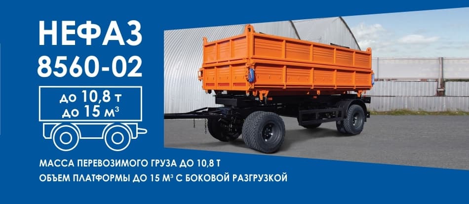Прицепы-самосвалы НЕФАЗ-8560, 8560-01, 8560-02 предназначены для перевозки различных сельскохозяйственных грузов, в том числе минеральных удобрений, а также сыпучих строительных грузов.